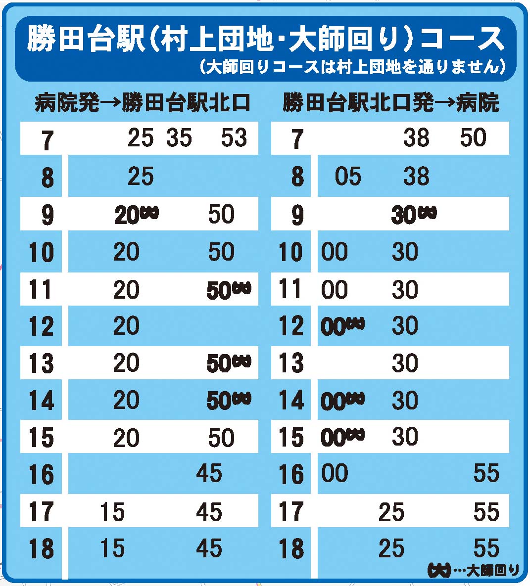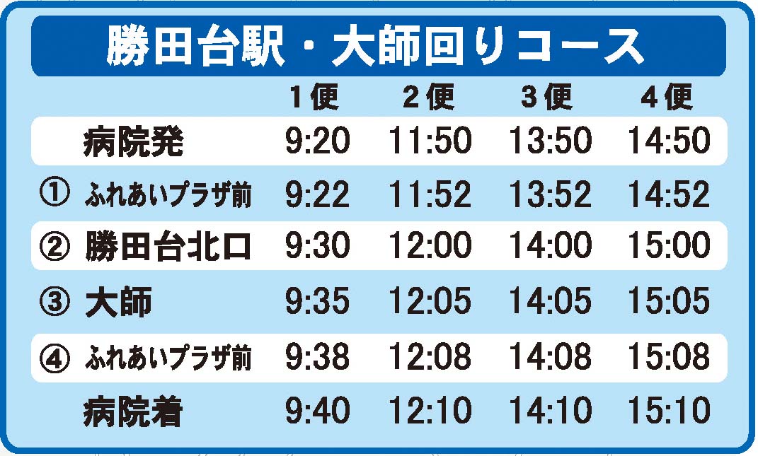 病院発~勝田台駅北口着・勝田台駅北口発~病院着 共に、所要時間は 約10分 となります。
