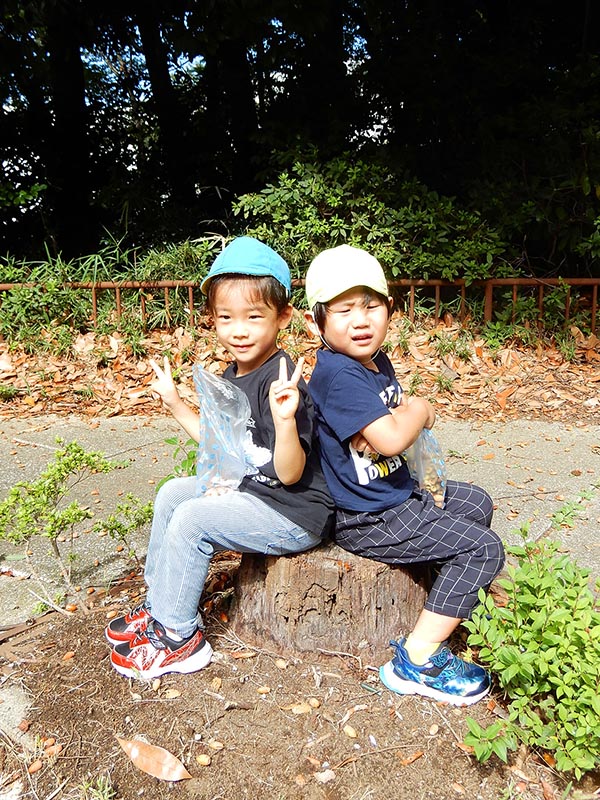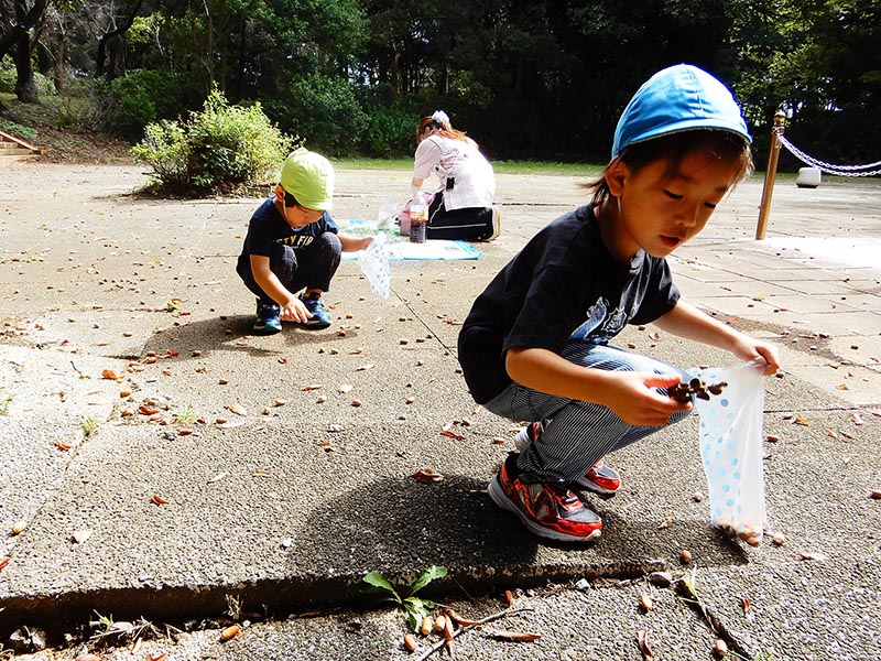 ちいさなお友達に、見つけたどんぐりを配って回る姿は