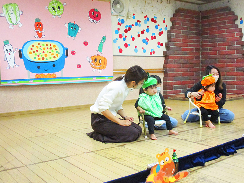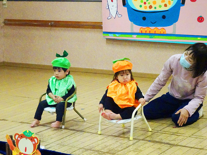 いよいよ0歳児の発表です。野菜に変身して踊ります。