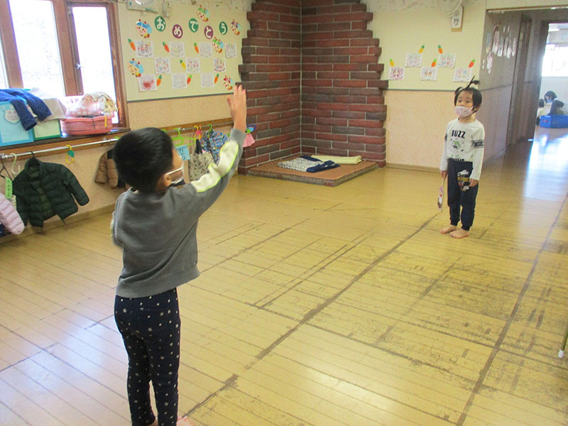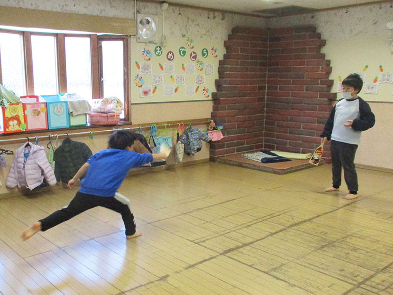 保育室「正月遊び」 ■ 正月遊び お正月遊びの羽子板に挑戦しました。幼稚園児と、小学生がそれぞれ 挑戦しましたが、迫力・スピードともに小学生にはかないません。 晴れ着を着て、優雅に羽根つきというよりは、オリンピックの バトミントン決勝のようでした。 今度挑戦したいのは、コマ回し! 凧あげも自分で作った凧をあげてみた学年もありましたが、写真を 撮り忘れてしまったとか・・・・・残念です。